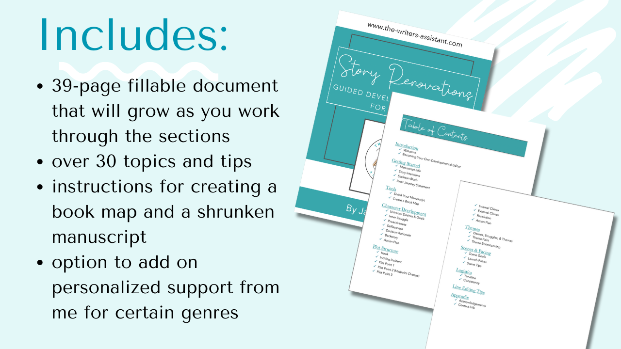 I struggled for a while trying to decide how I could still help authors, from offering classes to creating checklists or YouTube videos, and finally I landed on this idea: an in-depth digital workbook guiding authors through their own developmental edits! I put all the experience and knowledge I could into eight chapters of detailed questions, tips, suggestions, and instructions so authors can dig deep into their own work to figure out what’s working and what’s not, and even more importantly, how to FIX it.