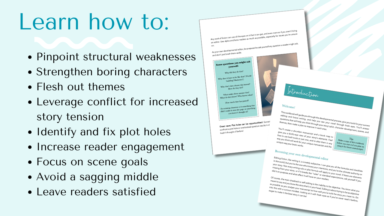 I hope that this workbook will not only take you through one developmental edit but will also give you the tools to make your future work stronger, knowing the kind of questions to ask yourself and the pitfalls to watch out for. It’s intended for use in the revision stages, but it can absolutely help with any stage of writing, even pre-planning, because it offers plot structure strategies as well as guidance on character development, themes, and individual scenes.