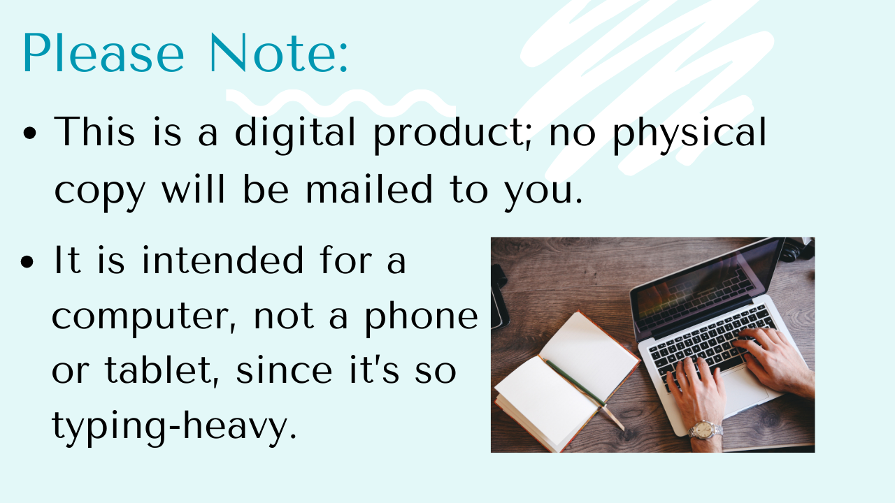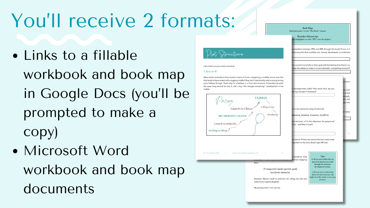 This is a digital workbook, so you’ll receive both a Microsoft Word document and a link to a Google Doc (you’ll make a copy for yourself) that you’ll fill in on your computer. The text boxes expand to fit however much you want to write, so you can analyze and brainstorm your story to your heart’s content.